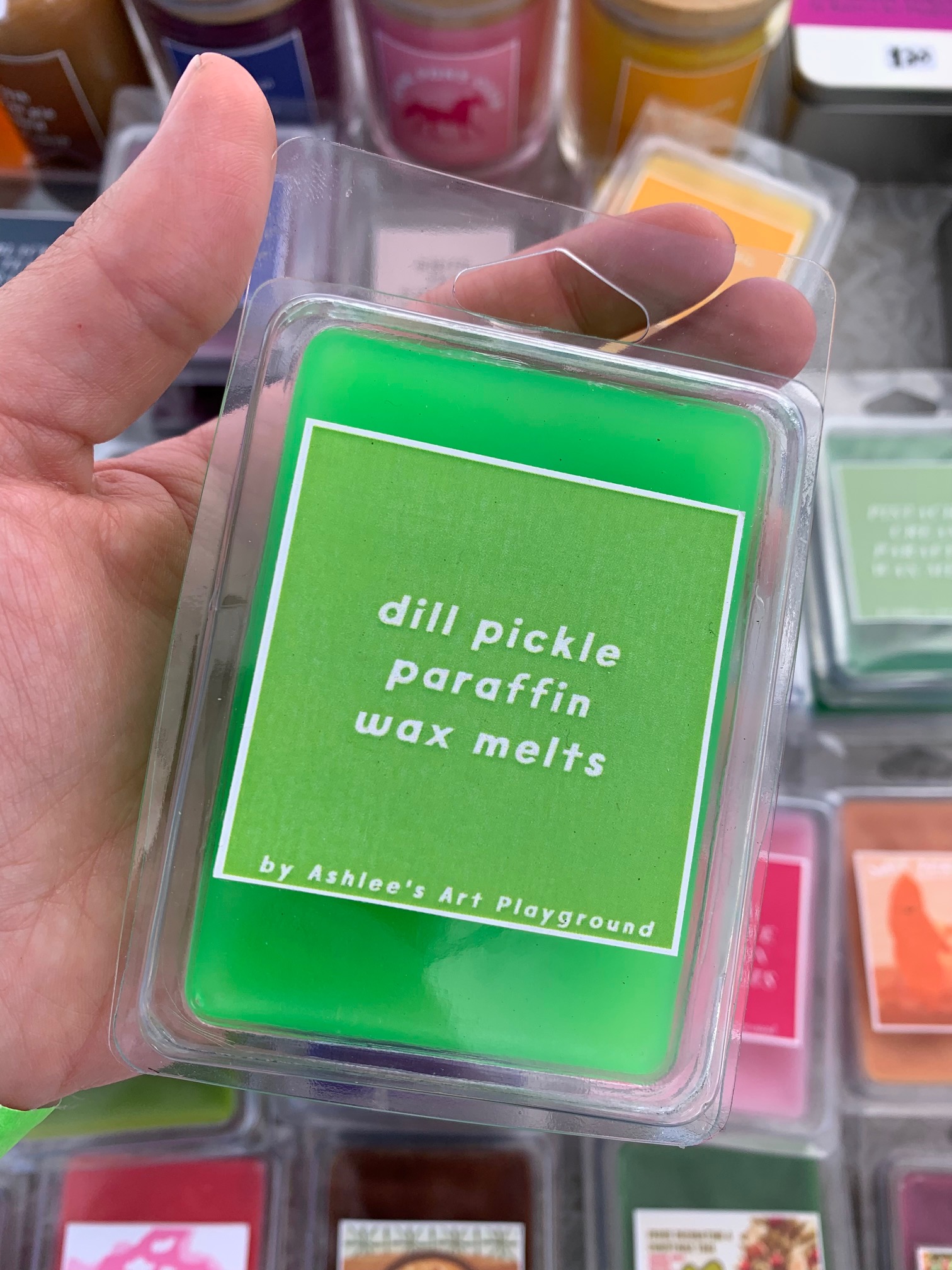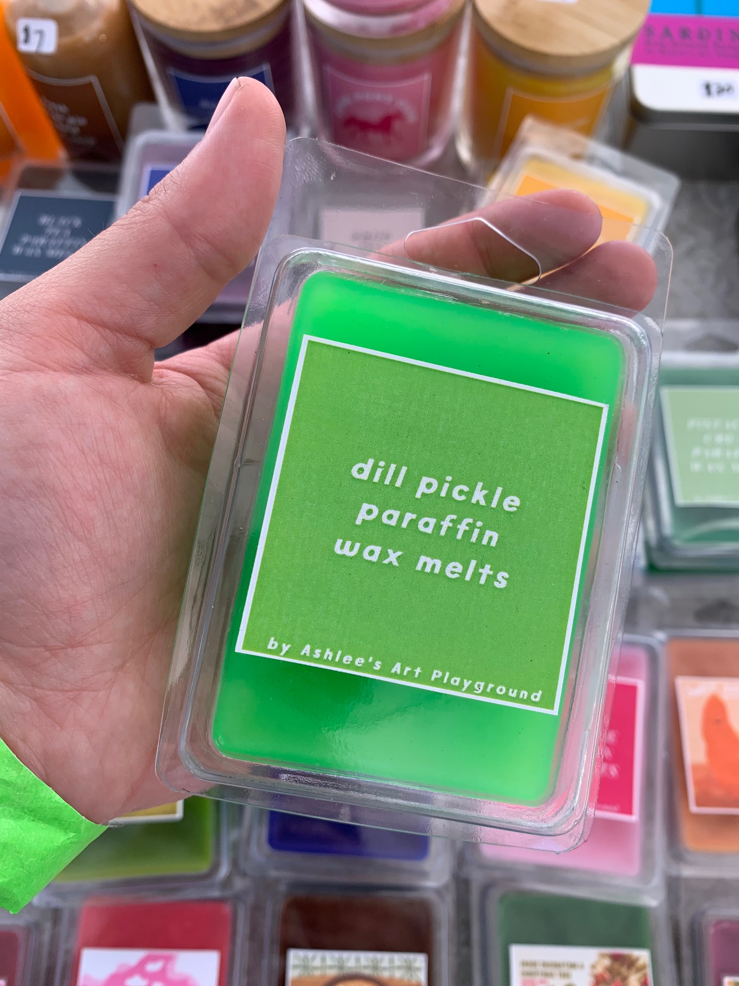 A set of six bright green handmade heart-shaped paraffin wax melts, which are dill pickle-scented!