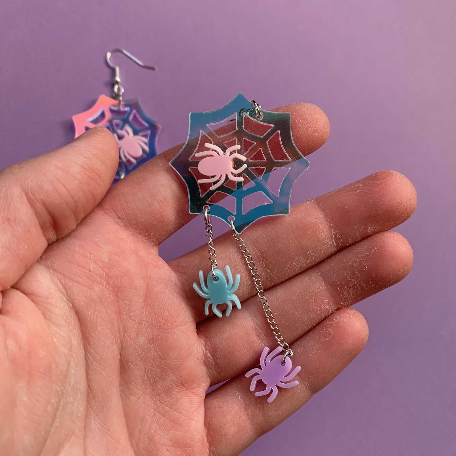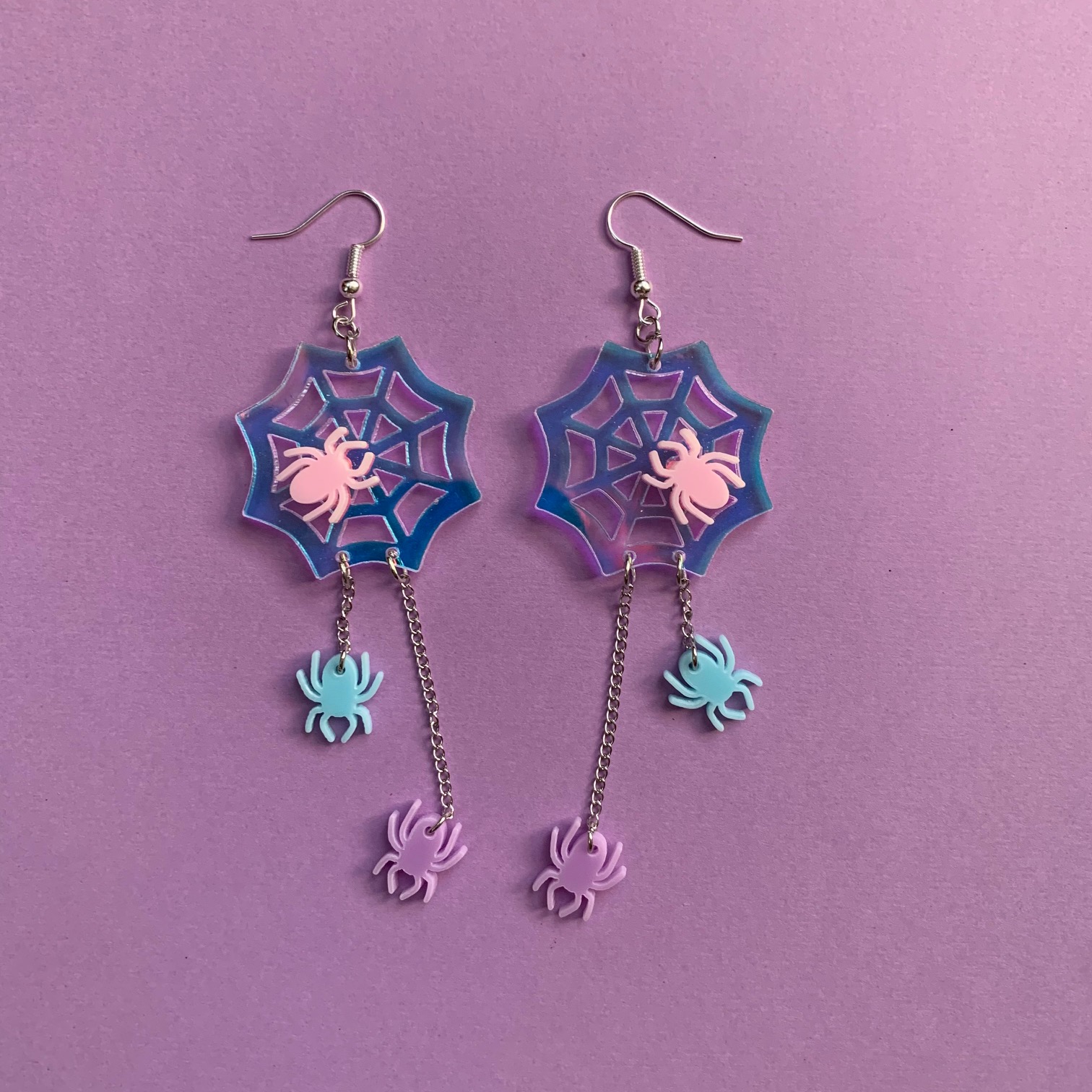 Holographic Pastel Goth Spiders on Web Earrings: Clip On Iridescent Spiderweb Jewelry