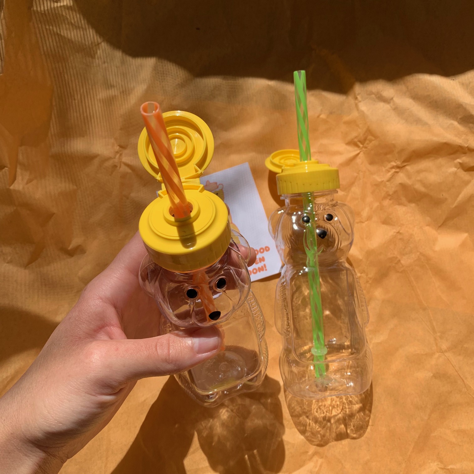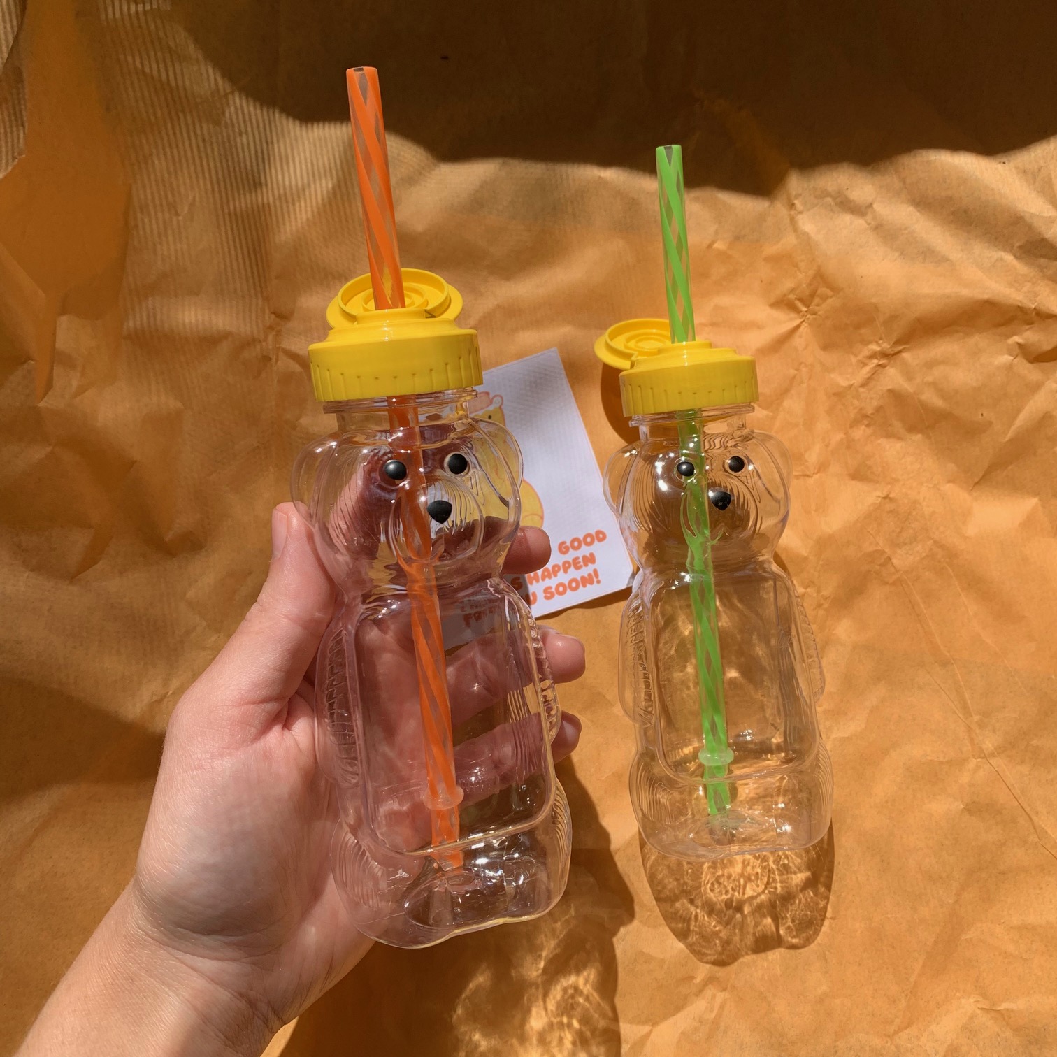 You’ll receive a gift set containing two 8-ounce plastic honey bear cups with lids, two plastic striped reusable straws in the colors of your choices, & one bear-themed notecard!