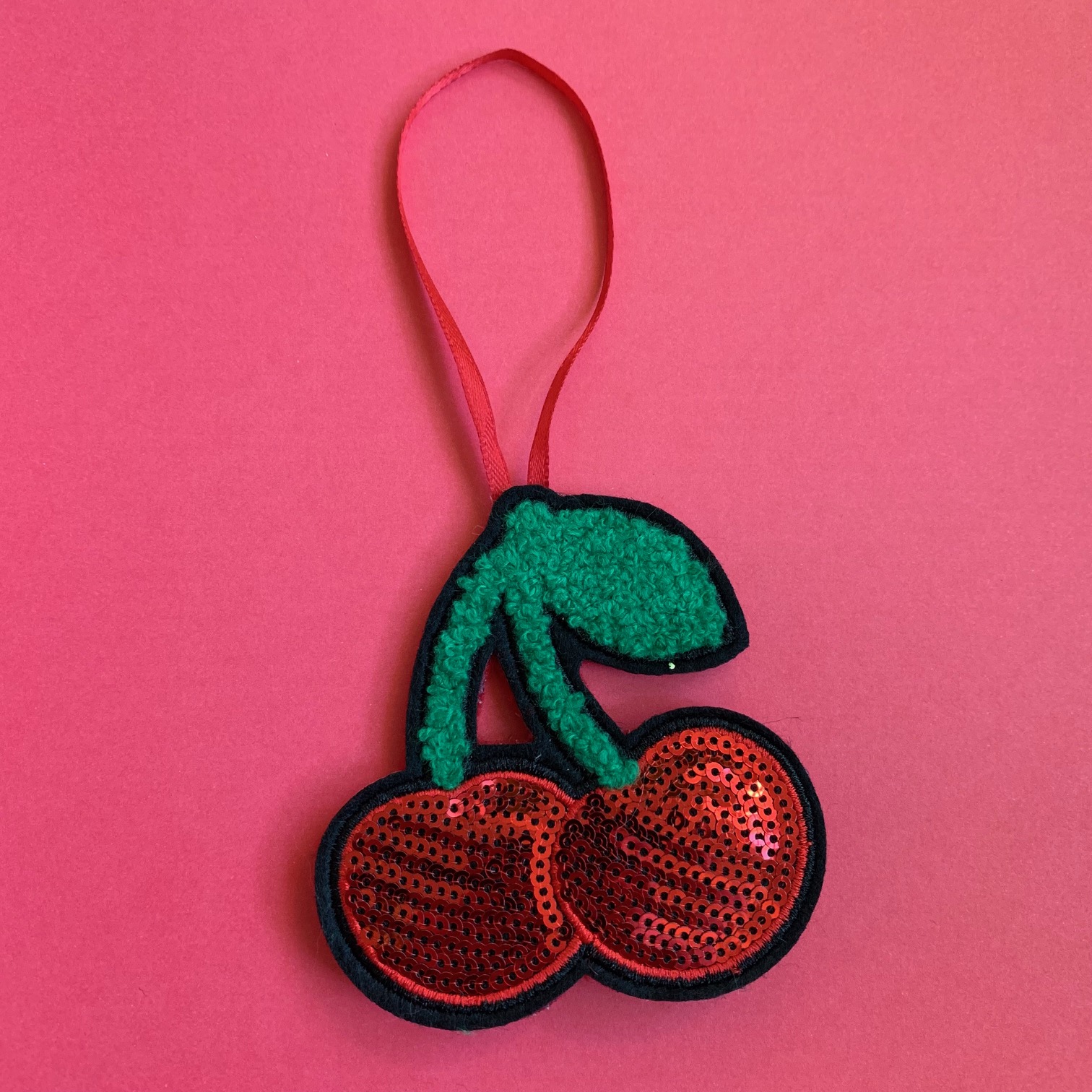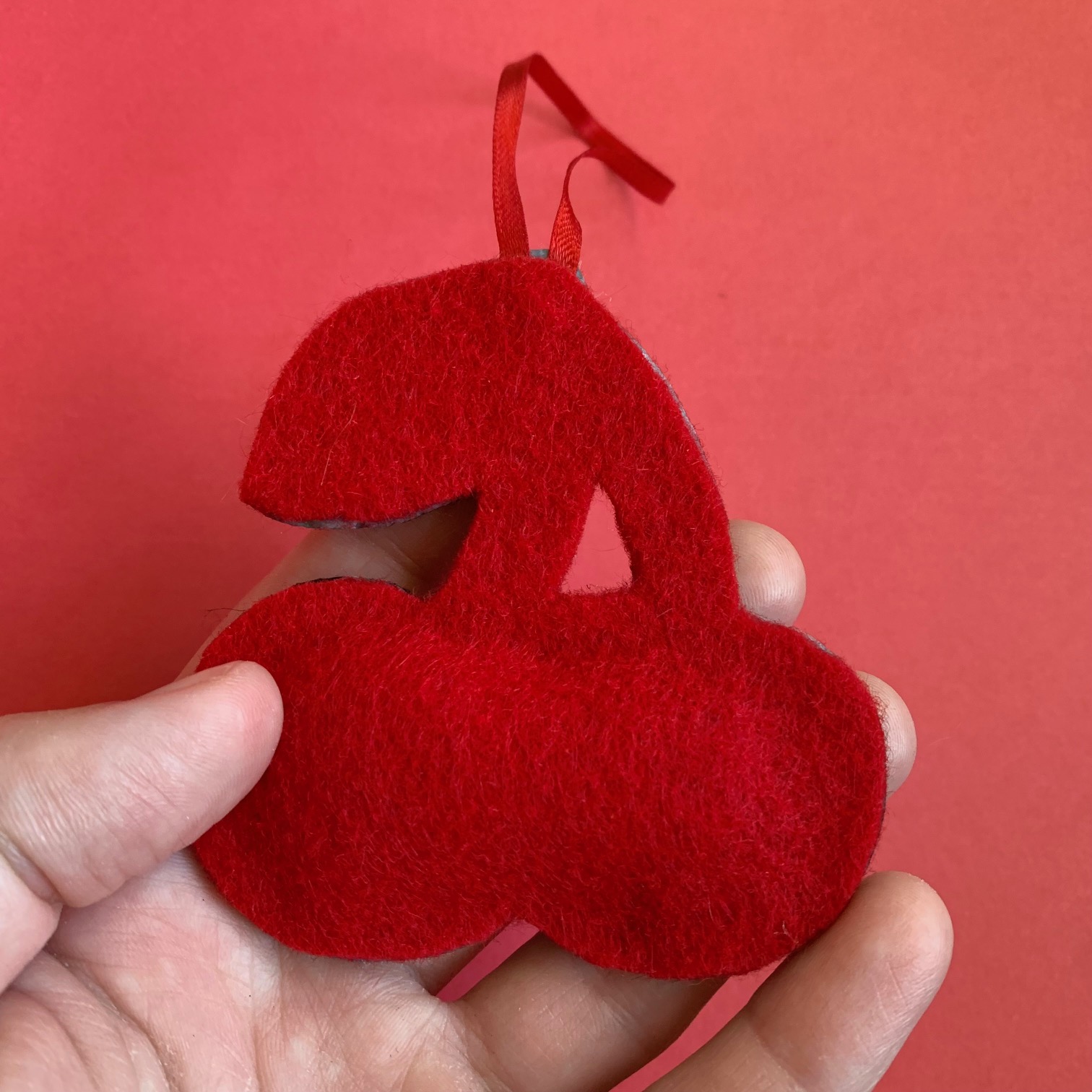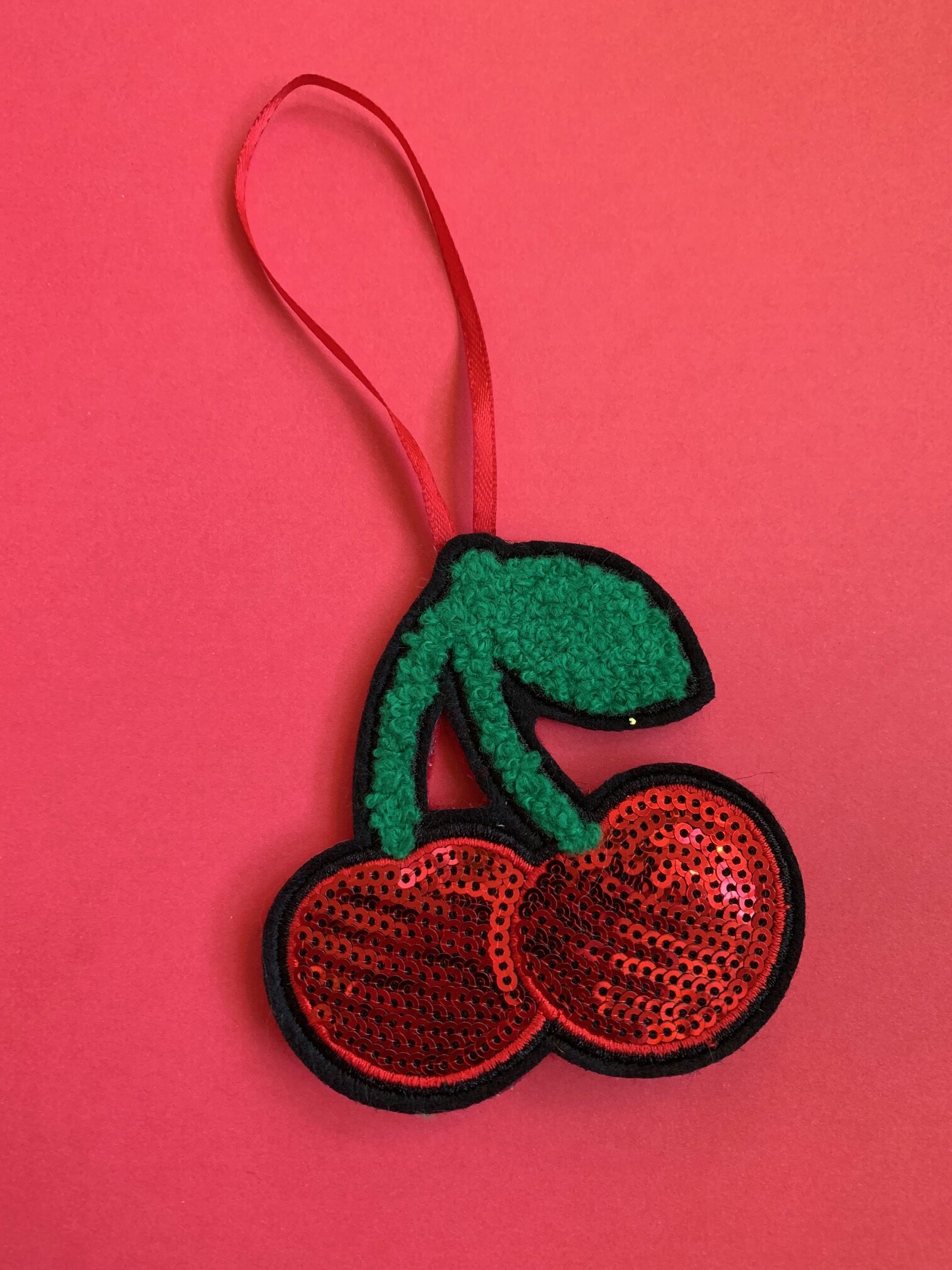This sequined embroidered ornament measures ~3″ x ~3, not including the red hanging ribbon on top!