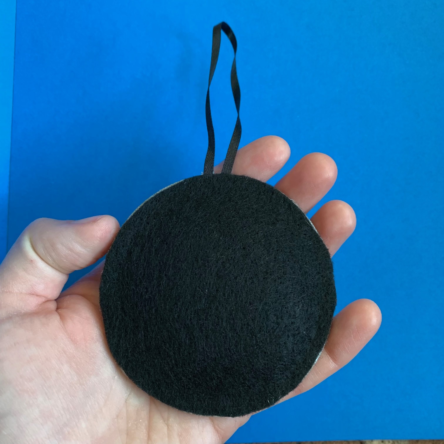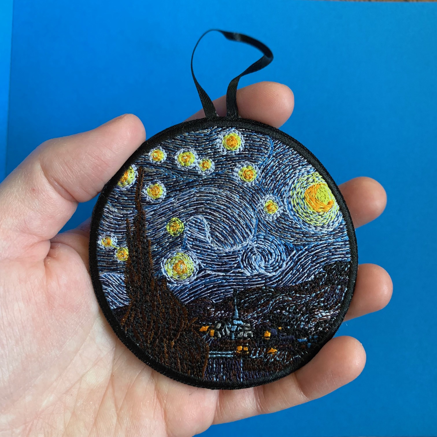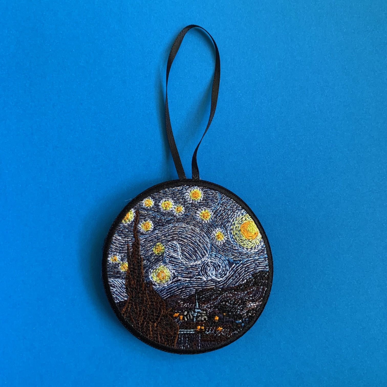 This embroidered ornament measures ~3″ in diameter, not including the black hanging ribbon on top!